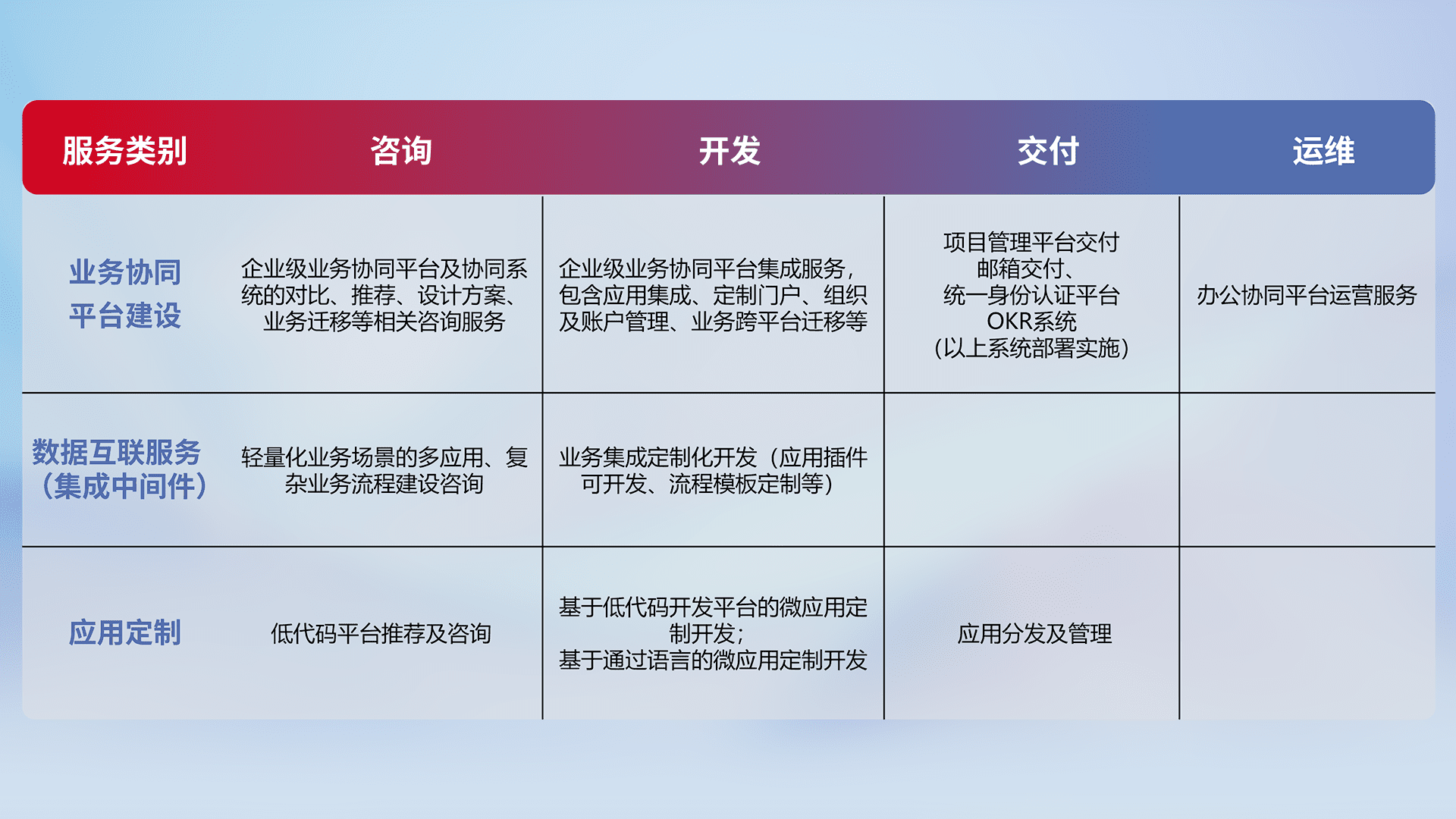 针对钉钉、、、、企微、、、IDaas等平台级产品提供产品的规划、、、方案、、、交付、、定制化开发等服务,,实现如统一协同办公、、智能客户服务、、、混合会议管理、、智能数据查询、、等业务场景,,实现数字化转型。。。。