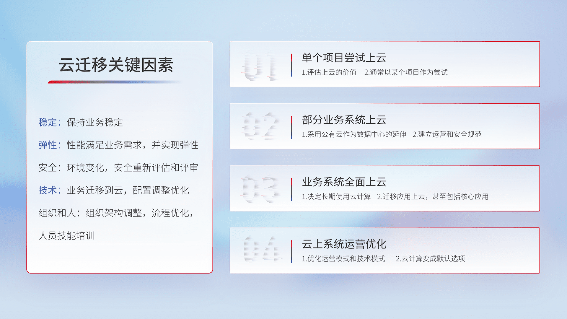 结合实际业务,,,,从规划设计、、云平台选型、、、云原生改造、、、数据迁移、、、集成交付,,,,迁移全过程为客户识别最佳上云路径,,,,做好风险识别管理,,,设计网络架构、、、身份权限、、、、安全审计合规、、操作审计、、、、日志审计、、、监控告警策略、、、、多站点容灾设计等,,,对云上基础设施进行整体规划,,提升IT治理水平,,,以满足弹性、、高可用、、、高性能的需求。。