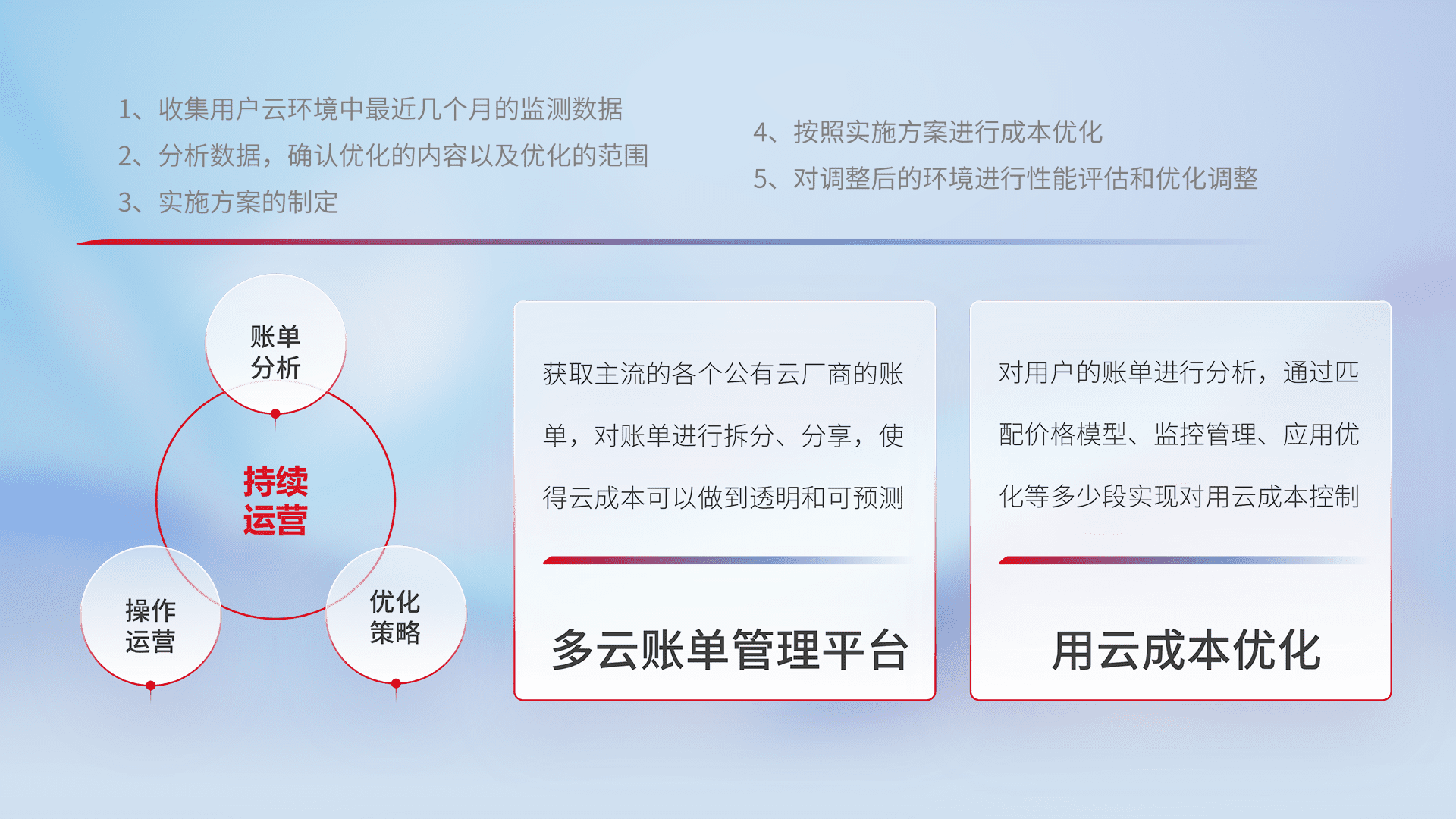 通过多云纳管,,,,以统一的资源数据模型把客户的云资源进行抽象和封装,,,进而实现对多云资源的统一操作,,,,保障云资源管理的可靠性、、、稳定性与可用性。。量身定制化运维内容,,配置、、、、开发运维、、、、补丁管理、、、、备份、、、监控、、、认证和访问管理、、、、审计和日常巡检等,,,保障在用云过程中的可靠度,,,稳定度以及高可用率。。