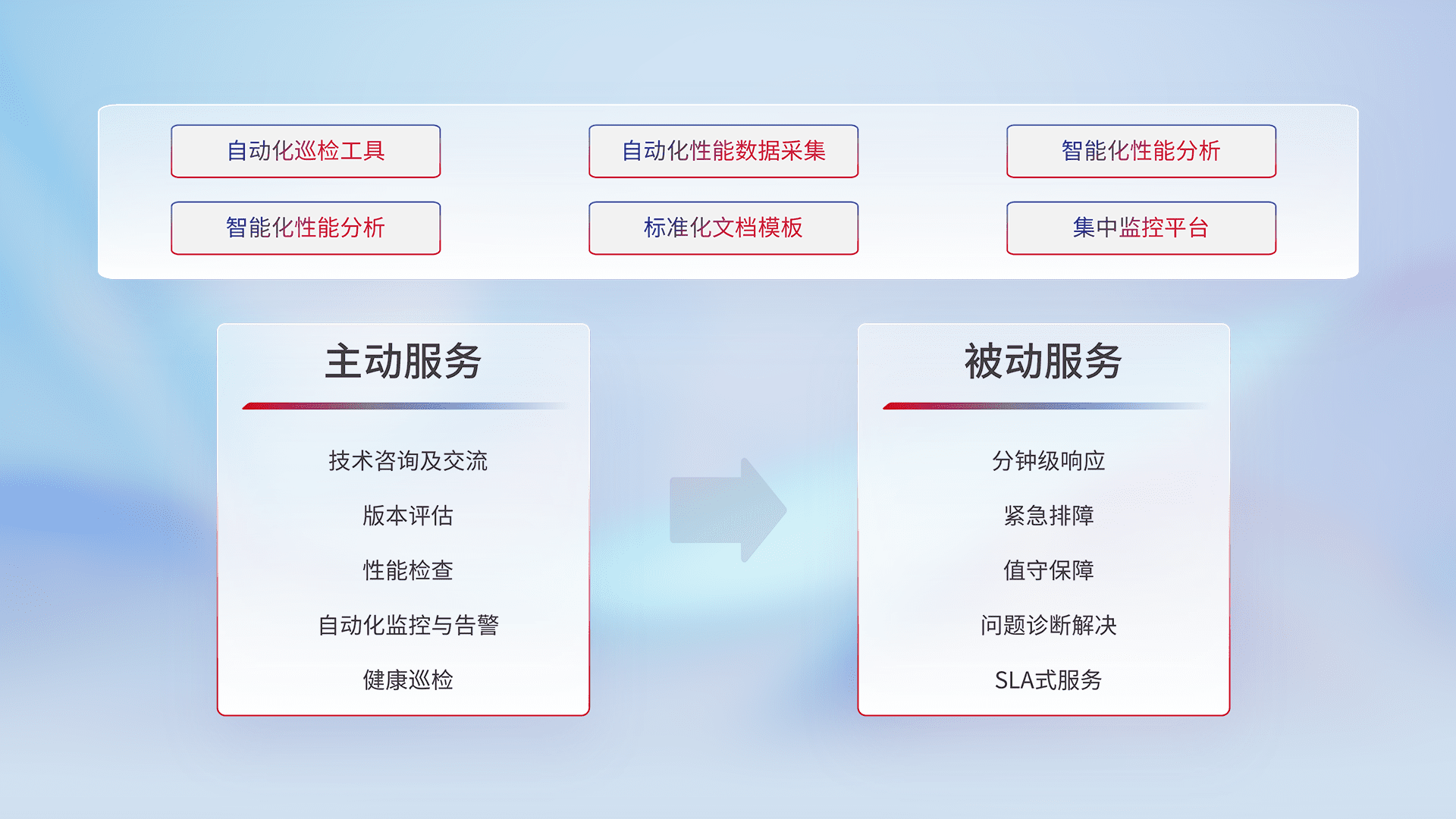 智能化工具和标准化文档,,保障服务质量,,提供主动服务(包含技术咨询、、、版本评估、、性能检查、、自动化监控与告警、、、健康巡检)和被动服务包含(分钟级响应、、紧急排障、、值守保障、、、问题诊断解决、、、SLA服务)。。。。